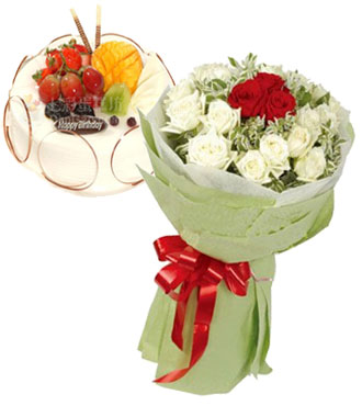 • 【中間紅玫瑰3枝,白玫瑰16枝外圍,高山積雪豐滿】+【8寸圓形鮮奶水果蛋糕】
