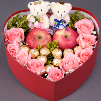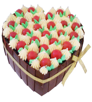 • 8寸心形水果鮮奶蛋糕,3朵奶油玫瑰花及時(shí)令水果。