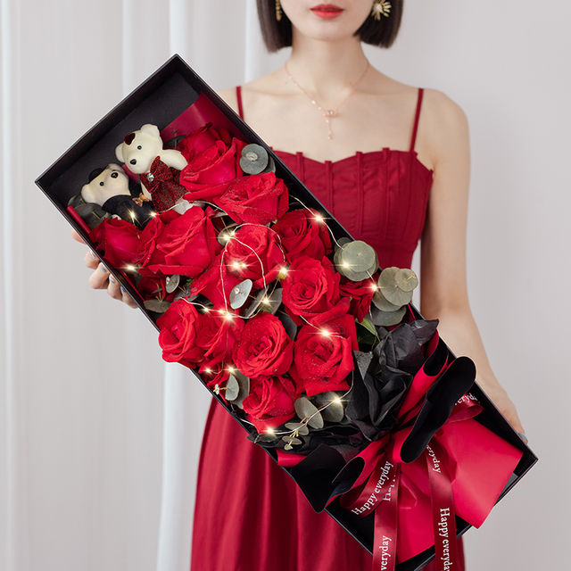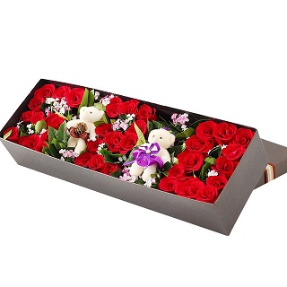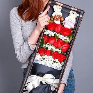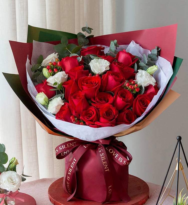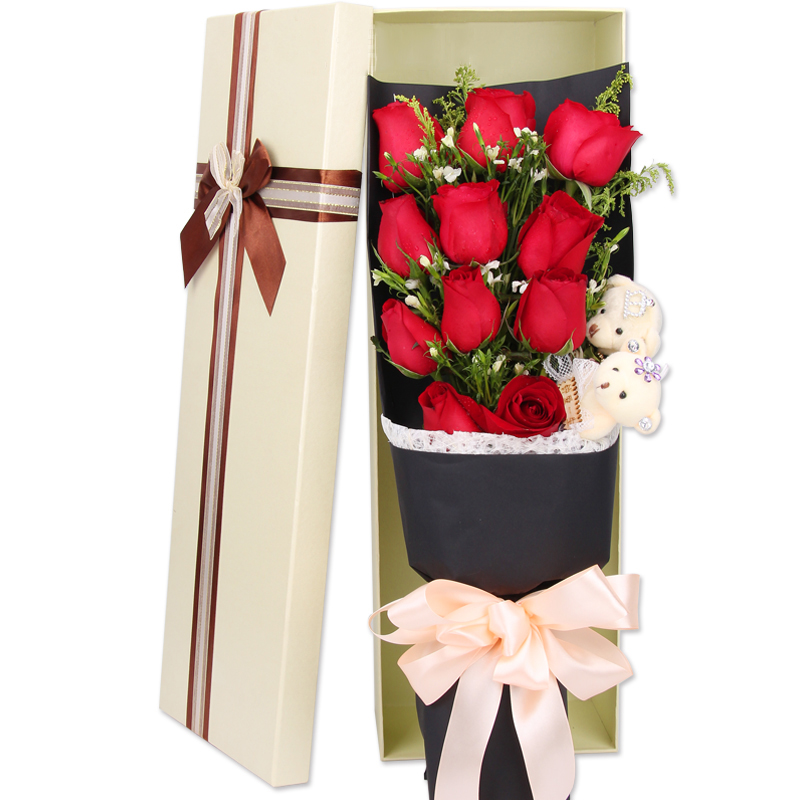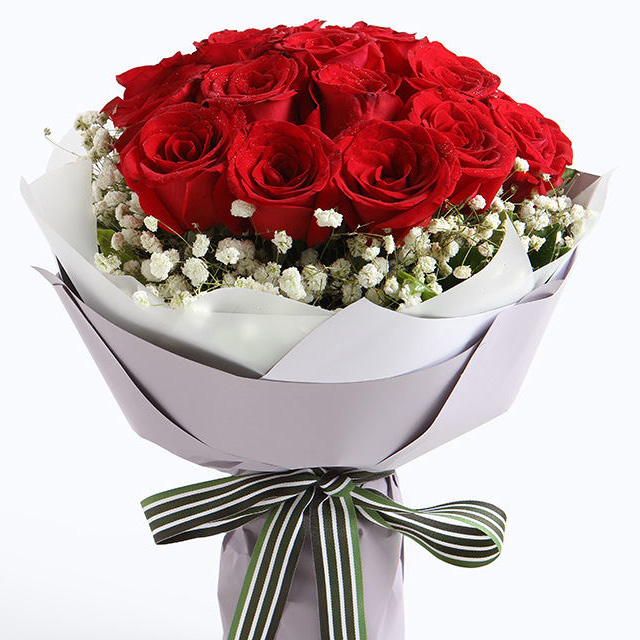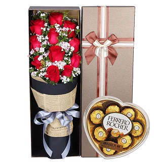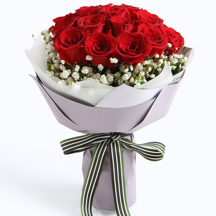 • 【11枝頂級(jí)紅玫瑰緊密居中,滿天星豐滿外圍】+【8寸巧克力蛋糕】