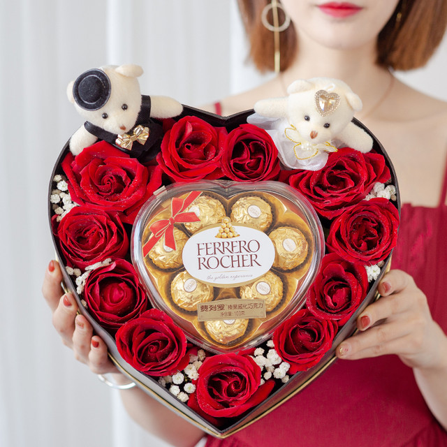 • 【19枝紅玫瑰,綠葉、滿天星 】 + 【德芙鐵盒心形巧克力(98克)】